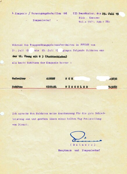 Als Kriegsdienstverweigerer durfte der Schreiber dieser Zeilen 1968 den Dienst mit der Waffe in der Bundeswehr ablehnen. Er musste andere Arbeiten verrichten, z.B. Toiletten und Duschräume reinigen, musste also nicht lernen, wie man Menschen tötet. Bei einer dann anstehenden offiziellen Prüfung wurde er nicht anerkannt als Kriegsdienstverweigerer. Er sollte dann, zurück in der Kaserne, an der Schießausbildung teilnehmen, P 8 und so. Er lehnte ab, weigerte sich, verwies auf seine Berufungsverhandlung etc, es nützte nichts, er musste schießen, so der Gesetzestext, da er„durchgefallen“ war.